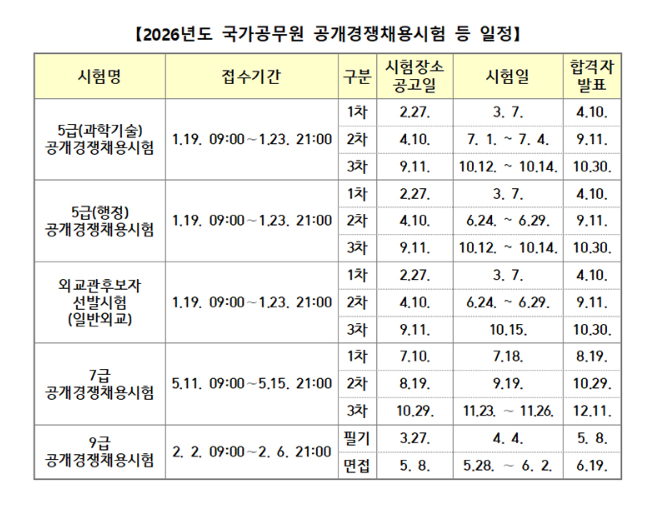 인사혁신처가 2026년도 국가공무원 공개경쟁채용시험(공채) 일정을 공식 발표했습니다.
